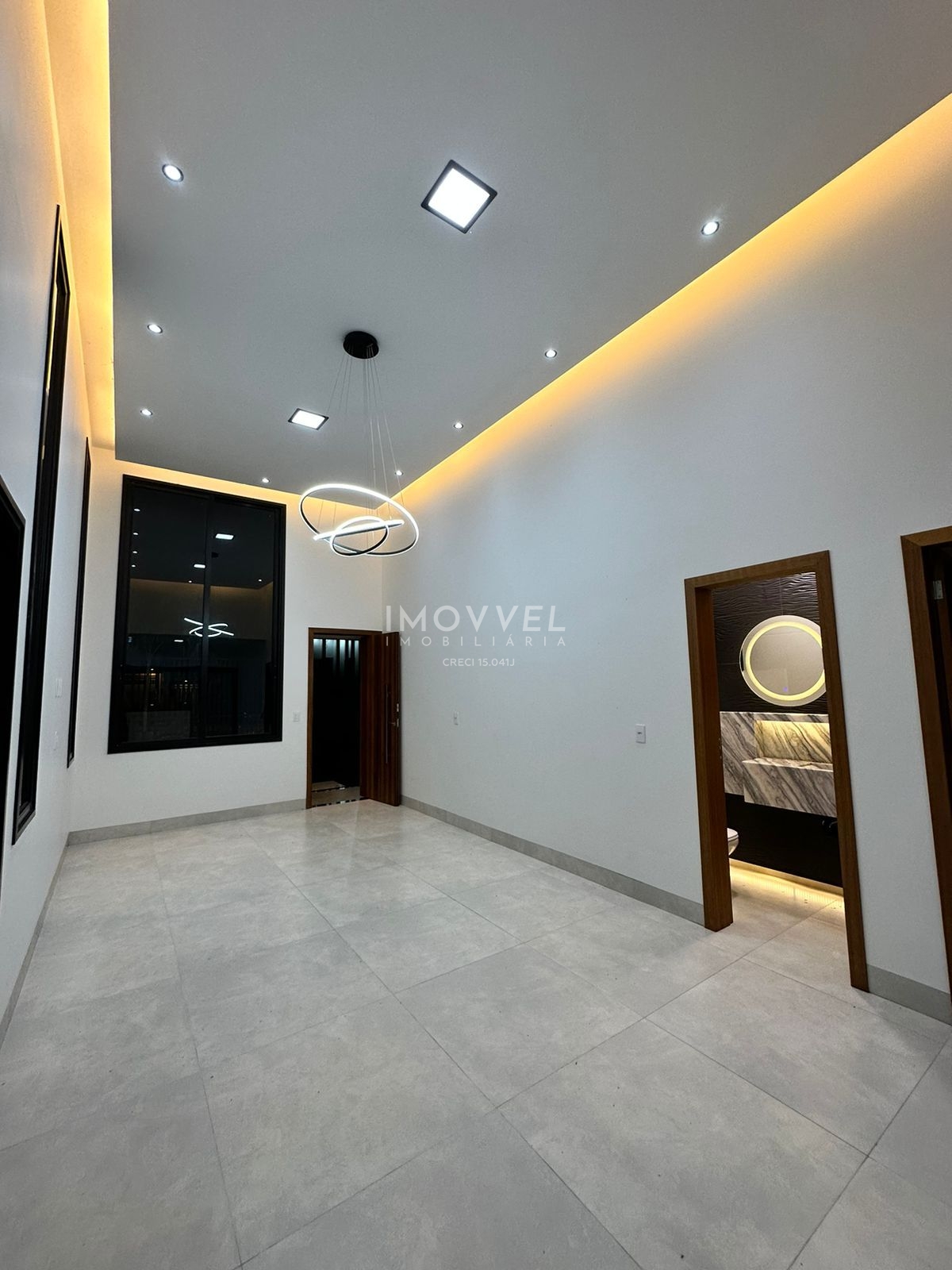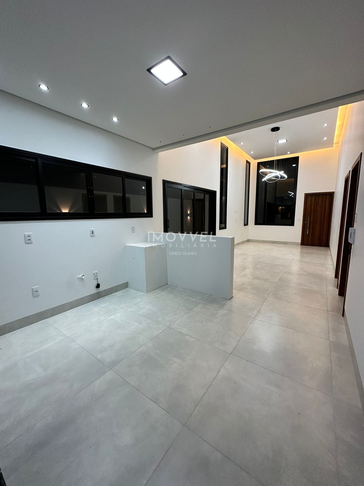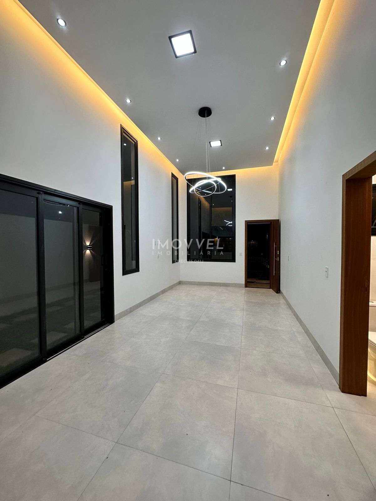Sala com pé direito alto, integrada a cozinha e a área gourmet